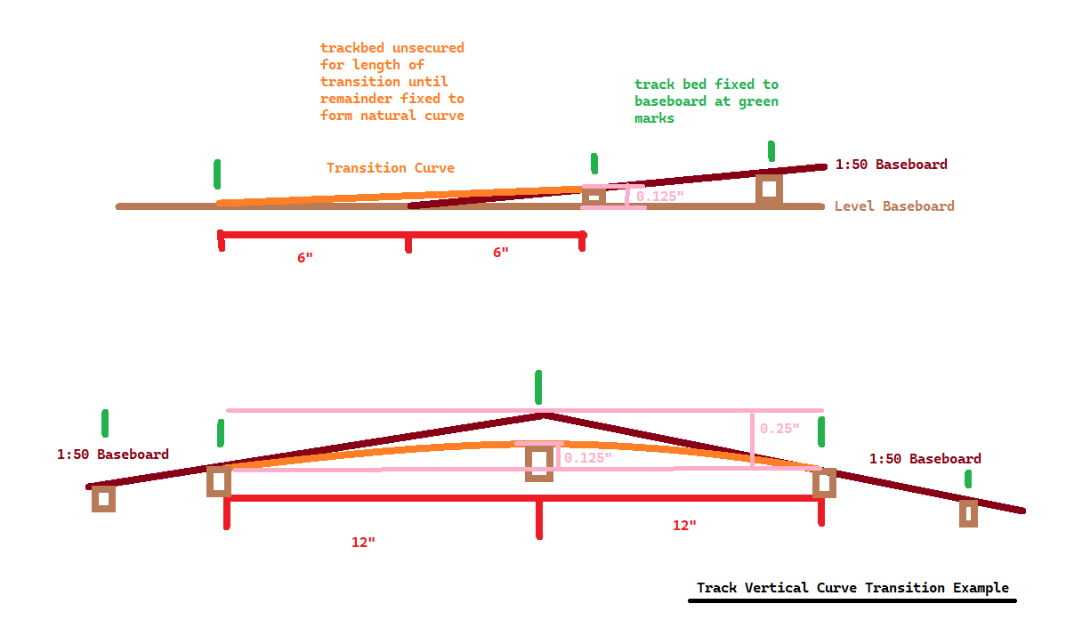 planning 1:53 and 1:86 gradients with maybe 6" to transition? and 12" for a "hump" from a track going up at 1:50 to descending at 1:86