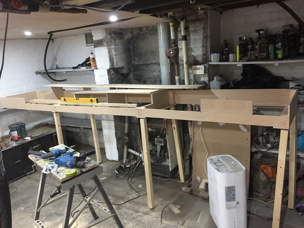 "Board A", aka the back left corner. one end supported by a shelf (the grey bit of wood bottom left, waiting for primer to dry so not in place on the wall brackets.. hence the whole thing not being even close to level).