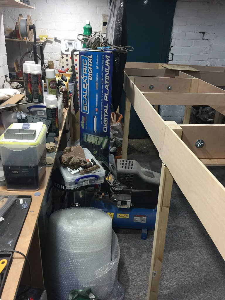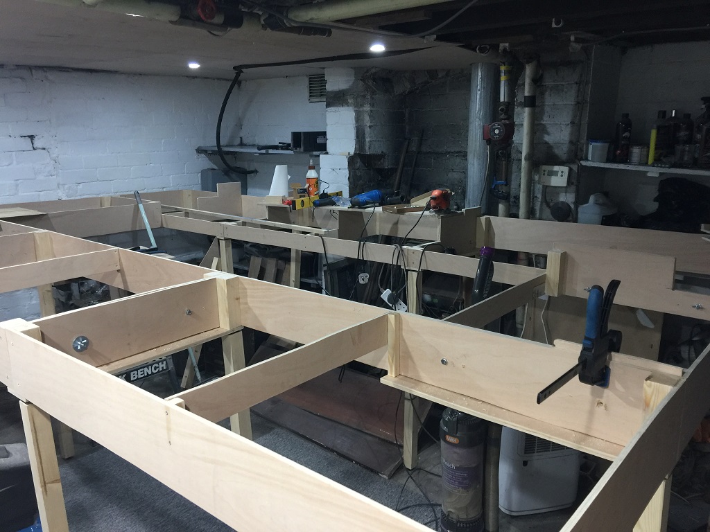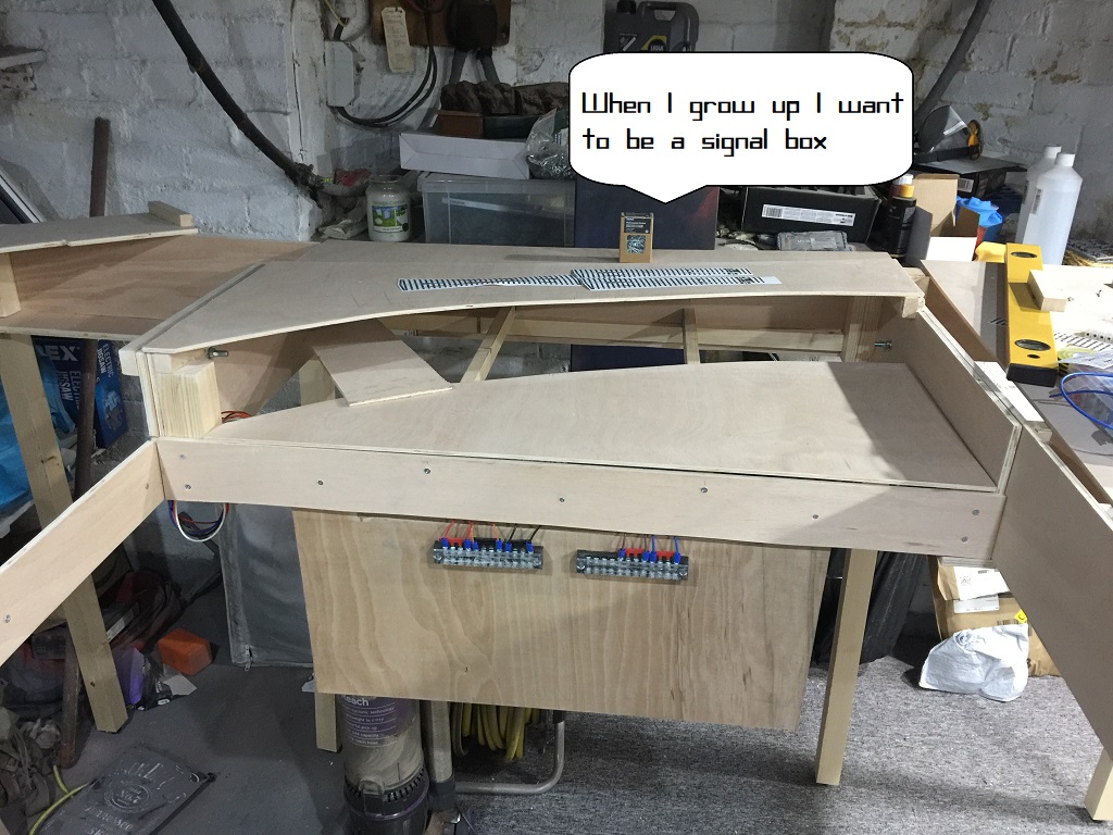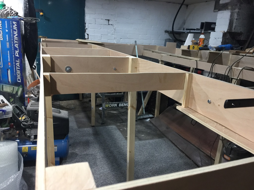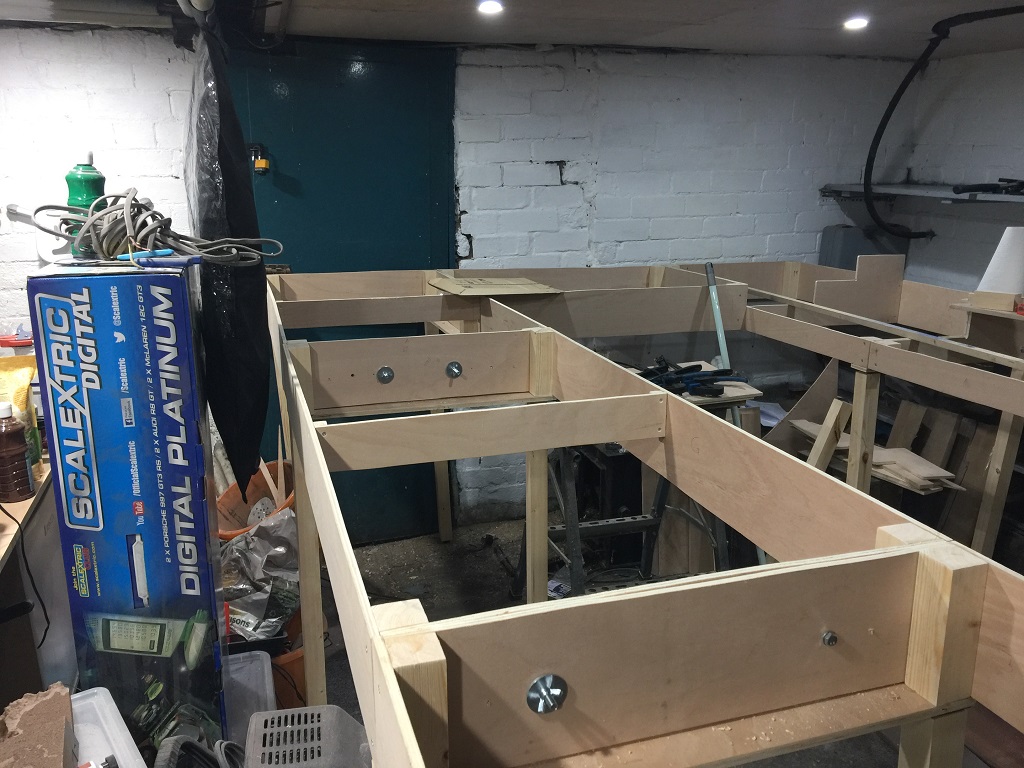 framing is 9mm plywood, track deck likely will be the same, there may also be more cross bracing added or the ply decks will gain stripwood bracing, not decided yet. aim is to build the whole frame - three modules long, in two rows, with smaller joining boards, and get that completed prior to adding the track deck to allow easier adding of bus wires and similar cruft.