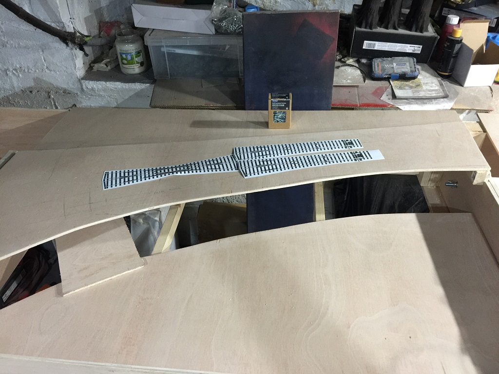 2'x4' module, three levels, the lowest is datum -3", this will be a purely scenic area, next is the start of what will be a 1:82 climb with a gentle transition at either end - there is a diagonal brace yet to be added to help with this in the corner to support the curved tracks. higher level is a 1:50 gradient the other way which will curve round 90 degrees on roughly a 19" & 21" radius curve.